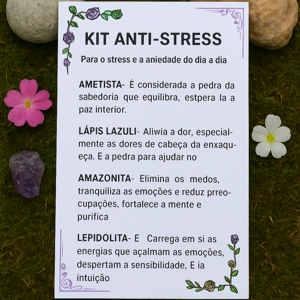 Reduza o estresse e a ansiedade com este kit cuidadosamente selecionado de pedras naturais, projetado para trazer calma, equilíbrio e bem-estar emocional. Cada pedra possui propriedades que ajudam a aliviar tensões, favorecer a paz interior e fortalecer a conexão consigo mesmo.